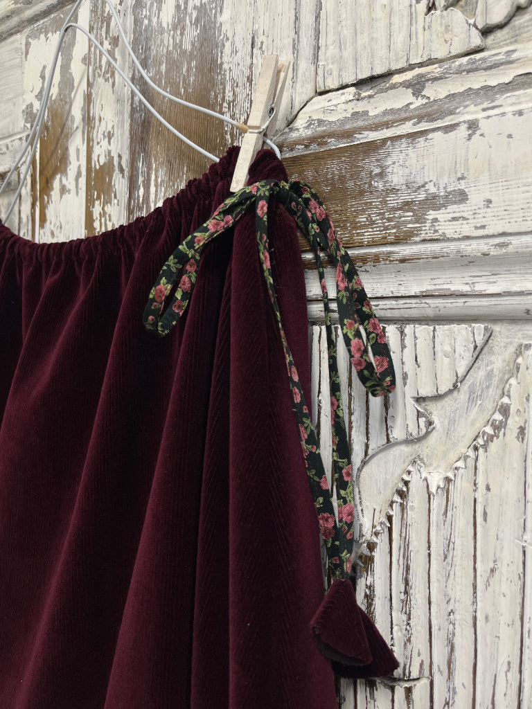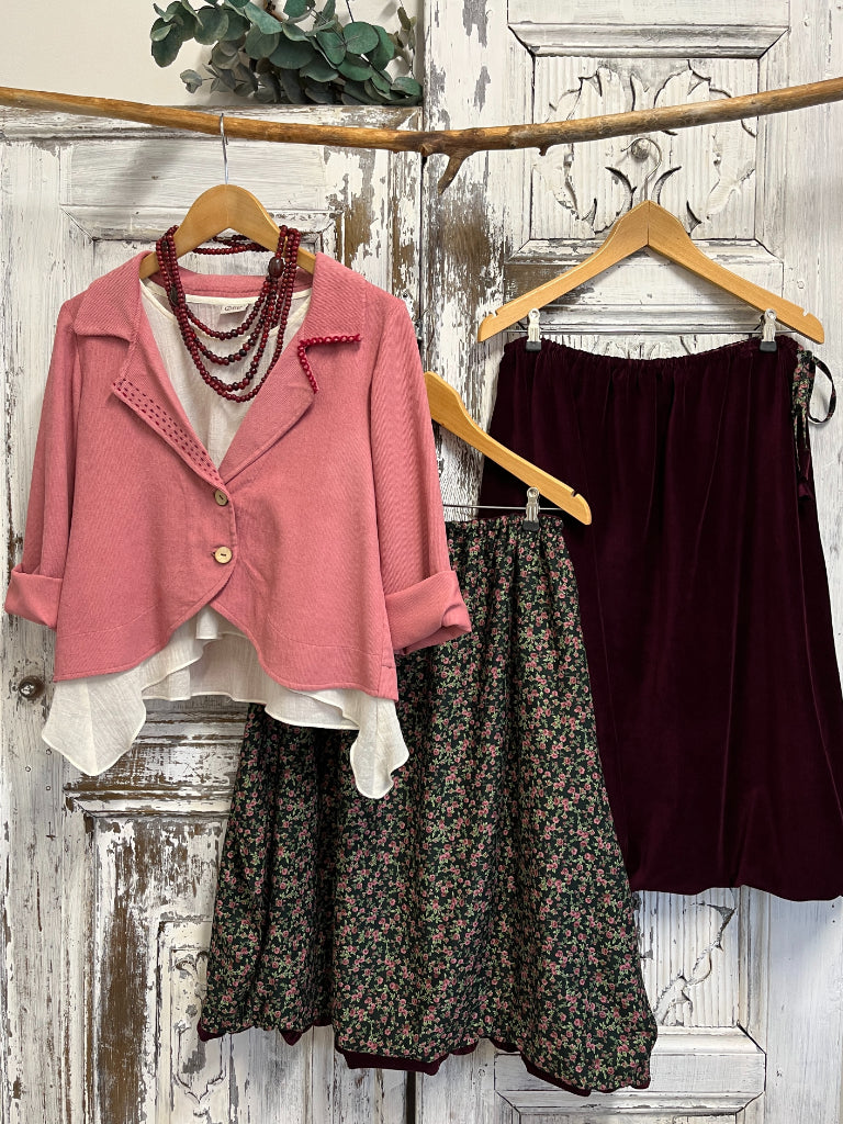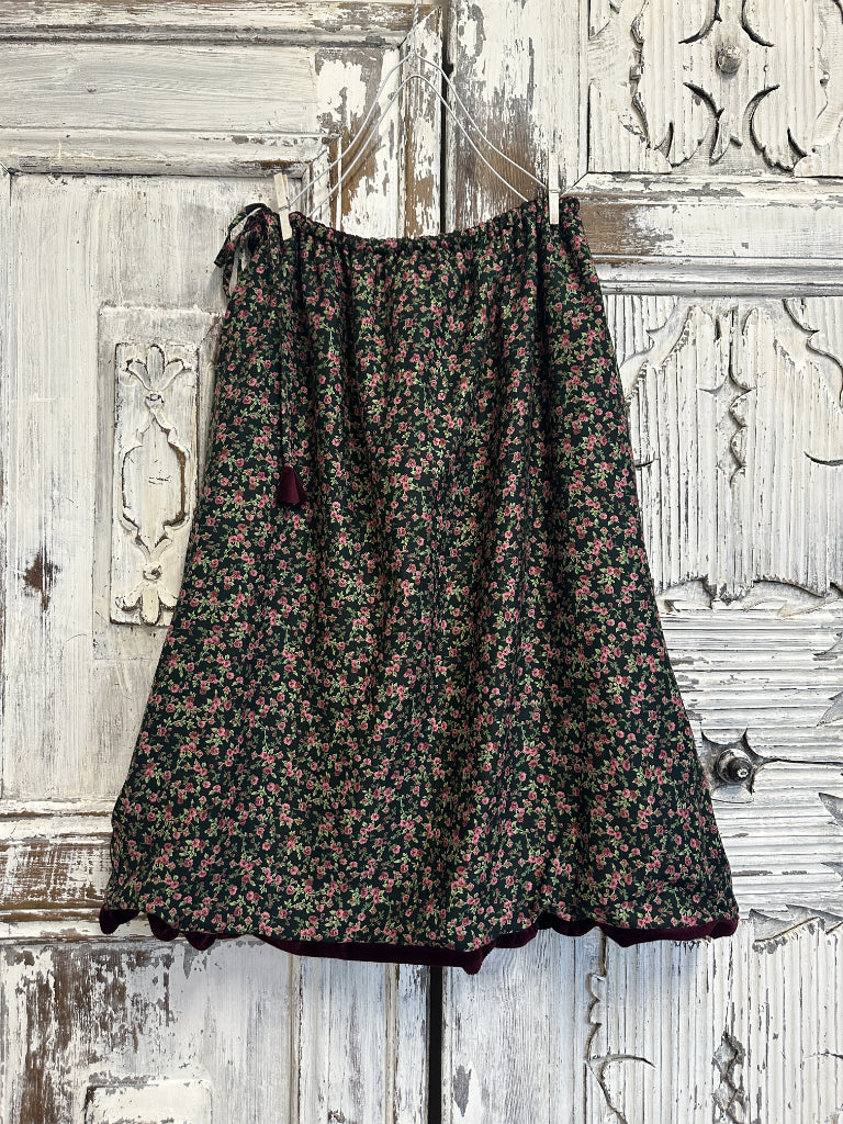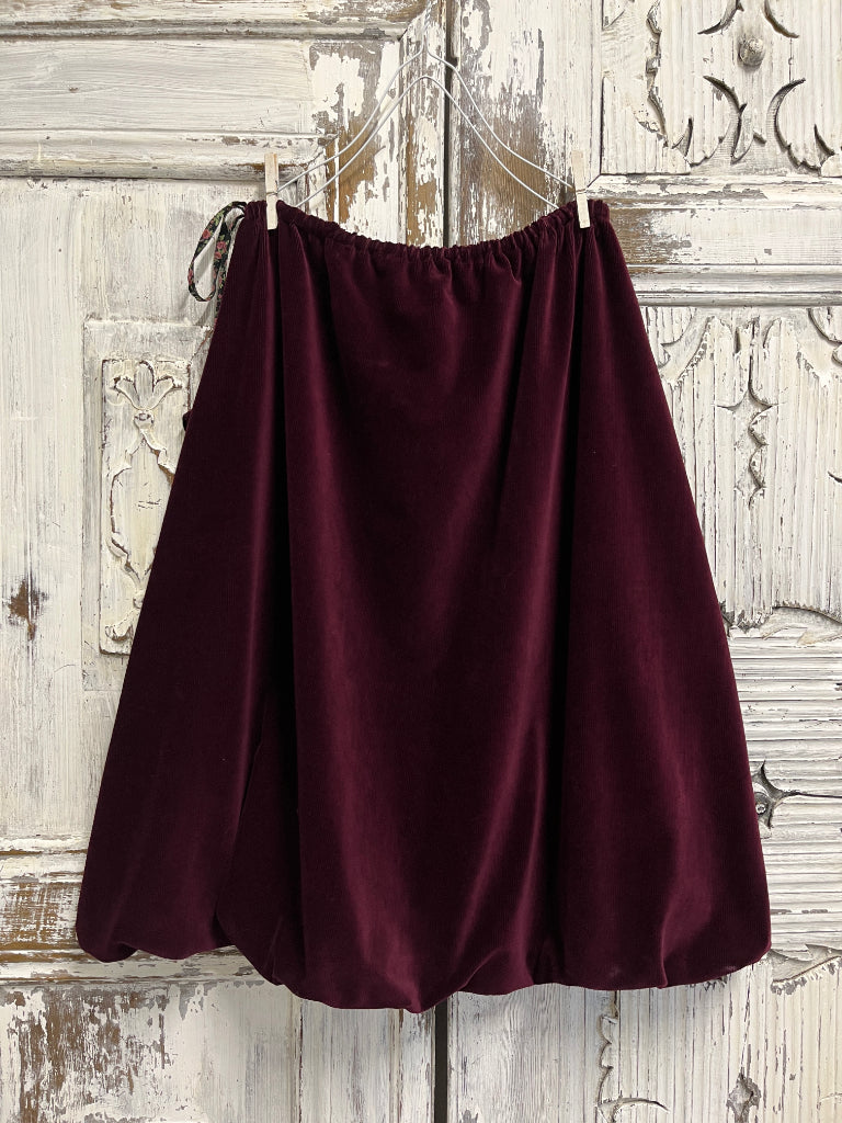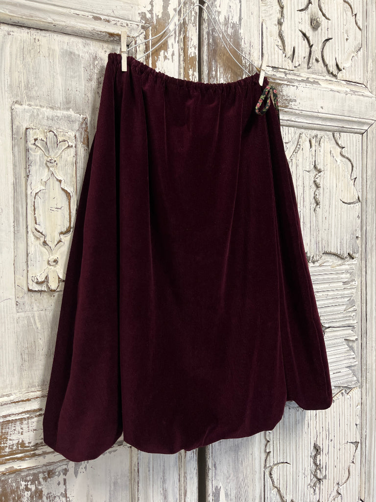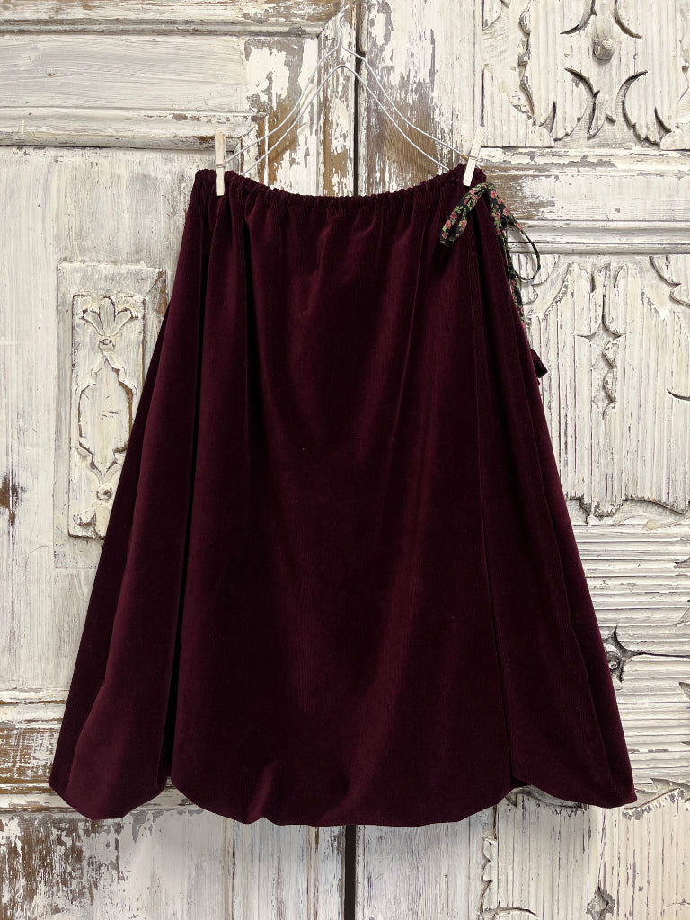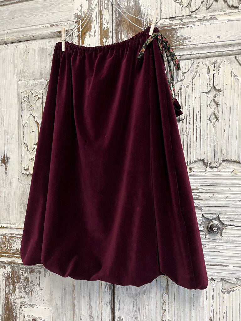 İki farklı stil tek bir parçada buluşuyor: Bu çift taraflı balon etek, bordo kadife yüzeyiyle sıcak ve sofistike bir görünüm sunarken, iç kısmındaki çiçek desenli pamuklu kumaşıyla daha canlı ve romantik bir alternatife dönüşüyor. Balon formu eteğe hacim kazandırırken, beldeki bağcık detayıyla kullanım konforu artırılmıştır. Günün ruhuna göre çevirip kullanabileceğiniz bu özel tasarım, gardırobunuzun en işlevsel ve dikkat çekici parçalarından biri olmaya aday.