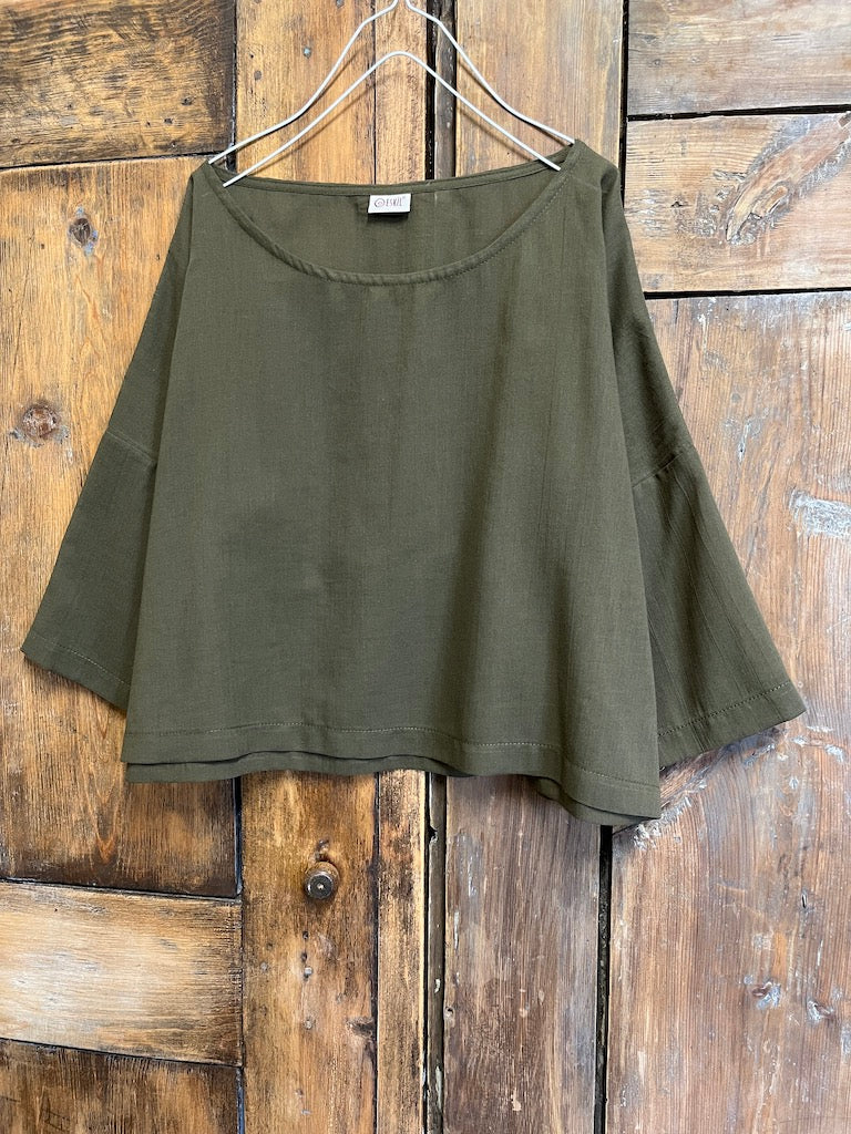 Bu sade haki bluz aynı kumaş detayı ile hazırladığımız askılı elbiseyle kullanıldığında şıklığı zahmetsizce ikiye katlıyor. Hafif yapısı ile mevsim geçişlerinde, serin yaz akşamlarında ideal bir tamamlayıcı.